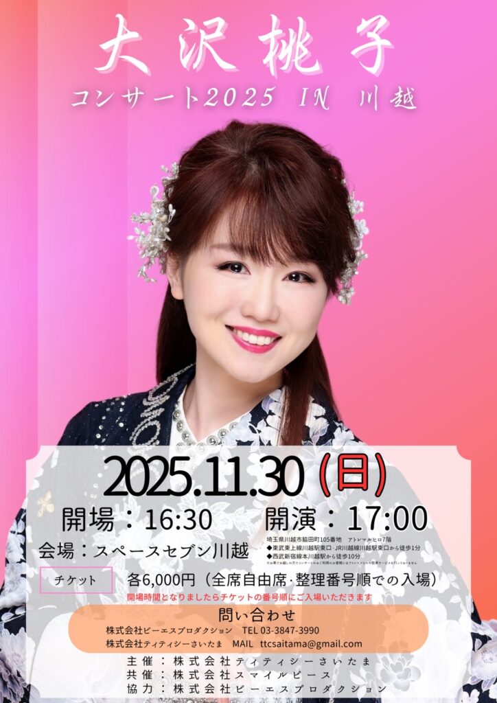 大沢桃子コンサート2025 IN 川越 2025 11/30 2025/11/30(日)音響担当 有料ライブ この記事が気に入ったら フォローしてね! Follow @ph_yutapi205 よかったらシェアしてね! URLをコピーしました! URLをコピーしました! 楠木康平2025コンサートIN川越 関連記事 楠木康平2025コンサートIN川越 2025年11月30日 滝さゆり/岡本幸太/知里 2025年11月29日 羽山みずき/大石まどか/舞乃空 2025年11月29日 華MEN組 歌謡ショー 2025年9月6日 prink × ヒロファームいちご狩り 2025年3月16日 けいたろう × ヒロファーム【いちご狩り&LIVE】 2025年2月16日 安達勇人ディナーショー 2025年1月19日 安達勇人 × ヒロファーム【いちご狩り&LIVE】 2025年1月13日