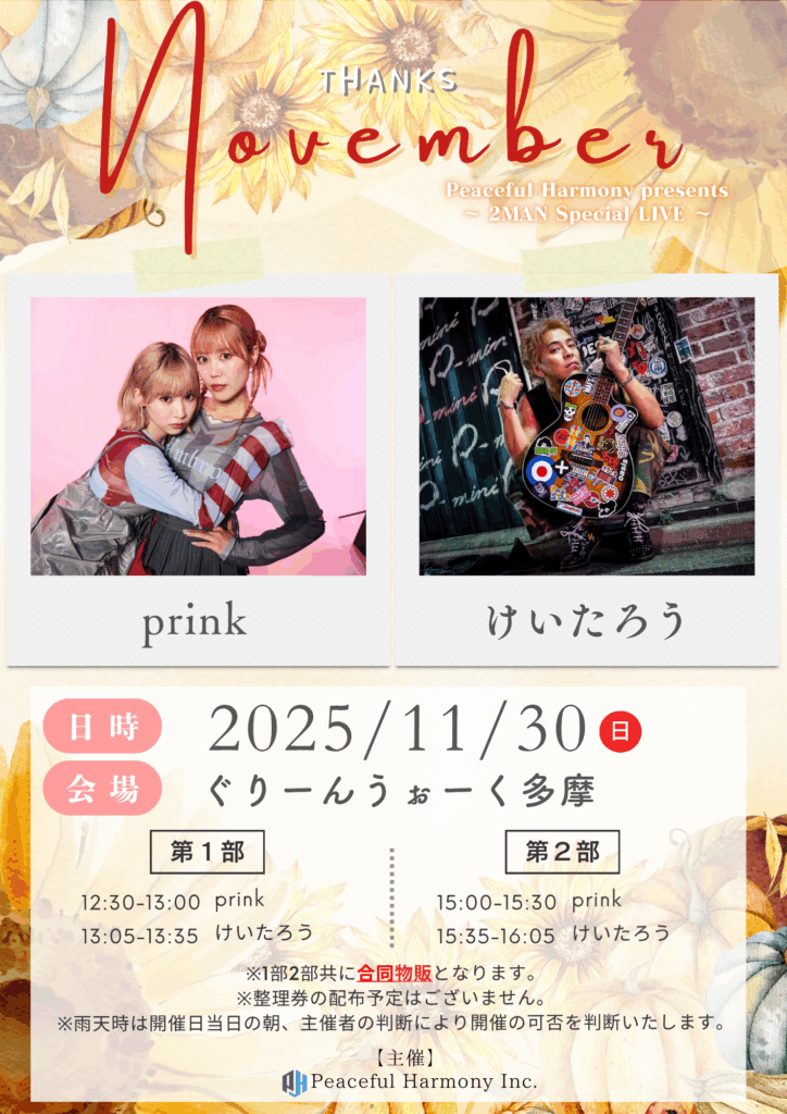 prink/けいたろう 2025 11/30 2025/11/30(日)ぐりーんうぉーく多摩音響、キャスティング担当 フリーライブ この記事が気に入ったら フォローしてね! Follow @ph_yutapi205 よかったらシェアしてね! URLをコピーしました! URLをコピーしました! 安達勇人軽トラLIVEツアー2025 in笠間宿(TOUR FINAL) 楠木康平2025コンサートIN川越 関連記事 安達勇人軽トラLIVEツアー2025 in笠間宿(TOUR FINAL) 2025年11月30日 けいたろう/prink 2025年11月29日 メルスタフェス2025 2025年11月29日 prink/B.A.C HOMIES/甘党男子 2025年11月20日 安達勇人 2025年11月16日 安達勇人×羽黒花火まつり 2025年11月15日 B.A.C HOMIES単独FREE LIVE 2025年11月15日 寺尾中学校閉校イベント 2025年11月9日