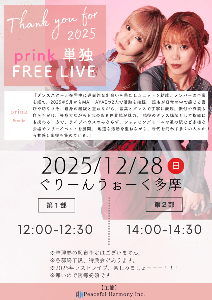 prink単独FREE LIVE 2025 12/28 2025/12/28(日)ぐりーんうぉーく多摩音響担当 フリーライブ この記事が気に入ったら フォローしてね! Follow @ph_yutapi205 よかったらシェアしてね! URLをコピーしました! URLをコピーしました! けいたろう単独公演〜町田市民ホール 大ホール〜 安達勇人NEW Year LIVE2026 関連記事 LIVE CIRCUIT excel✖️OPA 2026年1月12日 けいたろう単独FREE LIVE 2026年1月12日 prink新春ワンマンライブ2026 2026年1月11日 安達勇人ワンマンLIVE 2026年1月11日 めん❤️ぱら!Super FES 2026年1月10日 神が残した夢を喰う。単独FREE LIVE 2026年1月10日 安達勇人×鹿島チェリオ 2026年1月4日 けいたろう単独Free LIVE 2026年1月4日