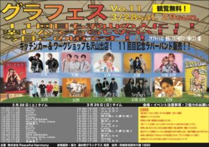 グラフェスVol.11 2026 3/30 イベント詳細 日付: 2026年3月28 – 29日 カテゴリ: 主催<FREE LIVE> この記事が気に入ったら フォローしてね! Follow @ph_yutapi205 よかったらシェアしてね! URLをコピーしました! URLをコピーしました! ちゅらさん祭り<3日間開催> 関連記事 ちゅらさん祭り<3日間開催> 2026年3月24日 Super Music Fes<Day2> 2026年3月24日 Super Music Fes<Day1> 2026年3月24日 あだちはうす部 2026年3月24日 青山新/梅谷心愛 2026年3月24日 安達勇人&君沢ユウキ1日店長イベント 2026年3月24日 安達勇人 2026年3月24日 津吹みゆ/門松みゆき 2026年3月13日